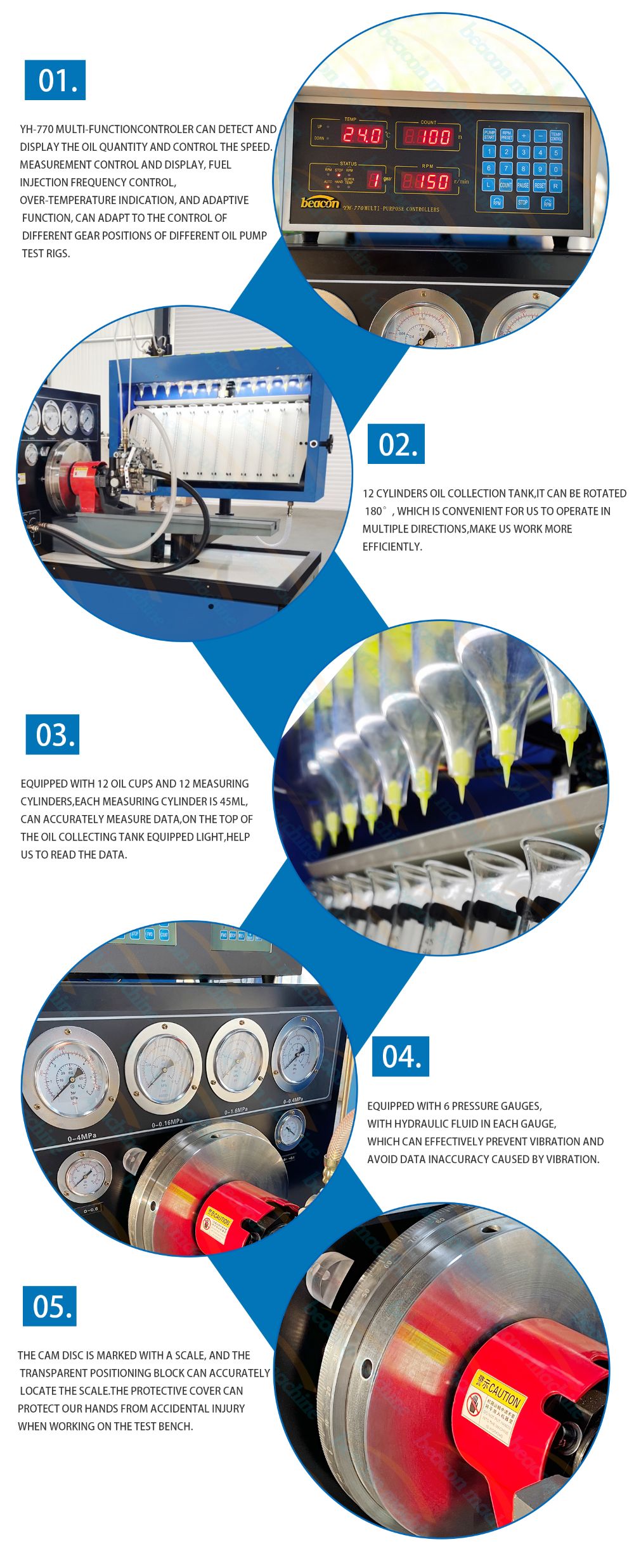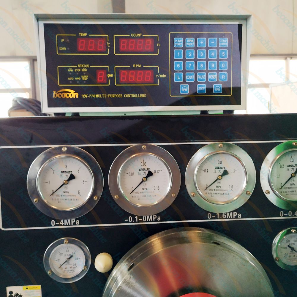 9. La velocidad de rotación, el conteo, la temperatura, la presión del aire, el ángulo de avance y el recorrido del bastidor se miden y controlan mediante computadoras en tiempo real, luego se muestran en un CRT de 17″ o, a pedido, en una pantalla táctil LCD de 17″.