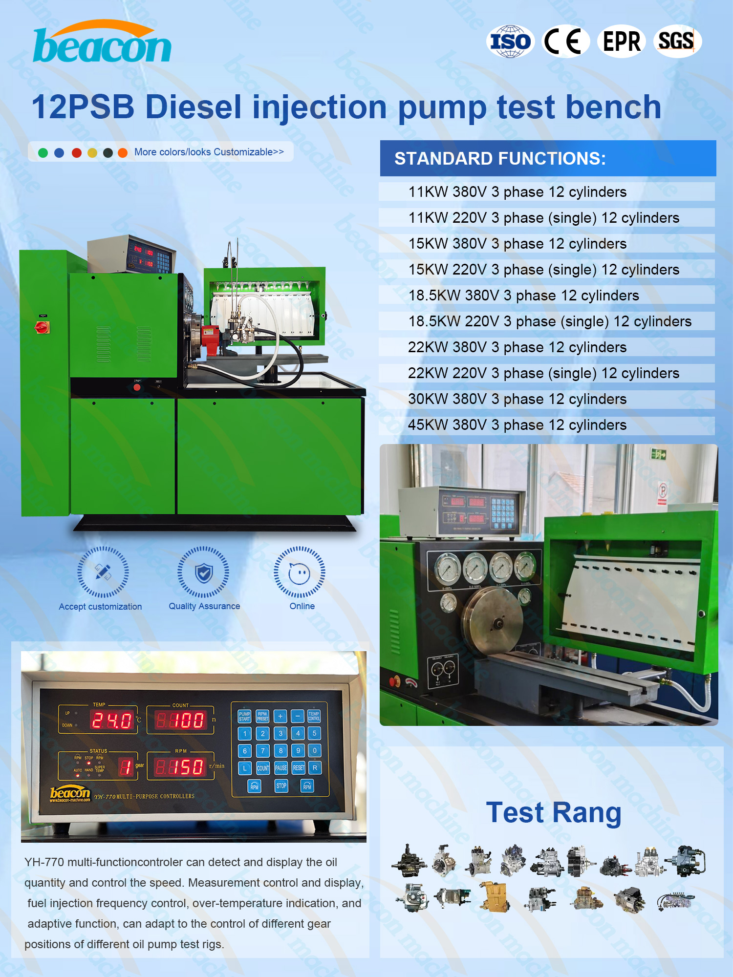 Serie 12PSB Máquina de prueba de inyección de combustible diésel Está diseñada para satisfacer las necesidades del cliente. Esta serie de bancos de prueba adopta un dispositivo de conversión de frecuencia de alta calidad y se caracteriza por su alta confiabilidad, ruido ultrabajo, ahorro de energía, alto par de salida, función de autoprotección perfecta y fácil operación. Es el tipo de producto de alta calidad y buen precio en nuestro negocio.