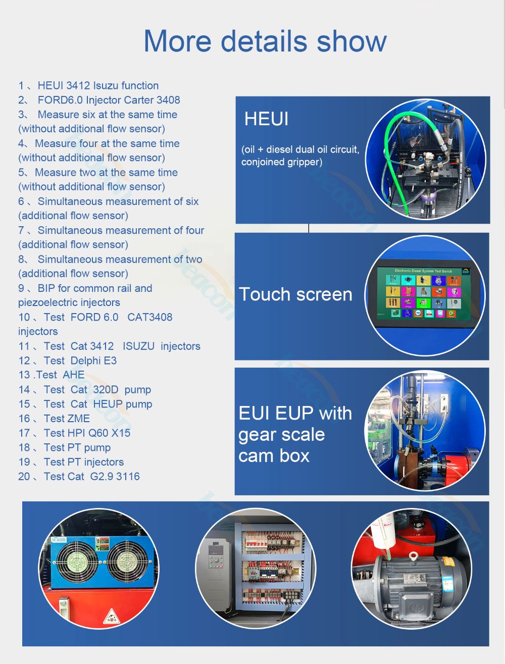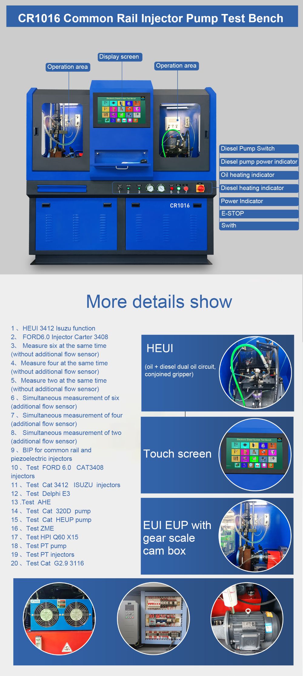 El banco de pruebas de riel común CR1016 tiene 3 motores independientes, puede probar el inyector y la bomba de riel común diésel, configurar EUI EUP CAMBOX y el adaptador Heui C7 C9, prueba opcional CAT320D, bomba Heui, prueba de inyector HPI ISX15 QSK60 PT