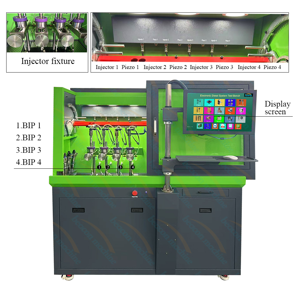 El banco de pruebas para inyectores Common Rail CR304S incluye soportes y adaptadores para inyectores, permitiendo probar simultáneamente hasta 4 inyectores con 4 sensores de flujo. Además, ofrece funciones de codificación de inyectores y BIP