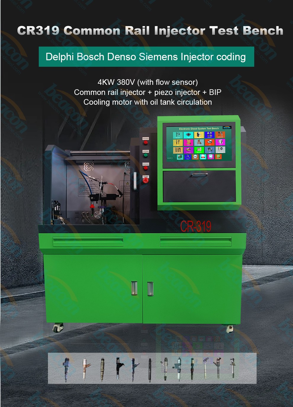 El banco de pruebas CR319 para inyectores common rail puede probar todo tipo de inyectores common rail y piezoeléctricos de marcas como Bosch, Denso, Delphi, Siemens, VOD, etc., y también permite la codificación de inyectores