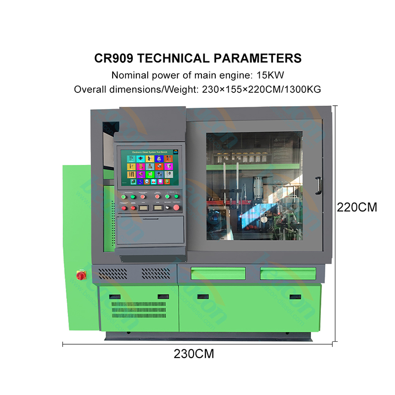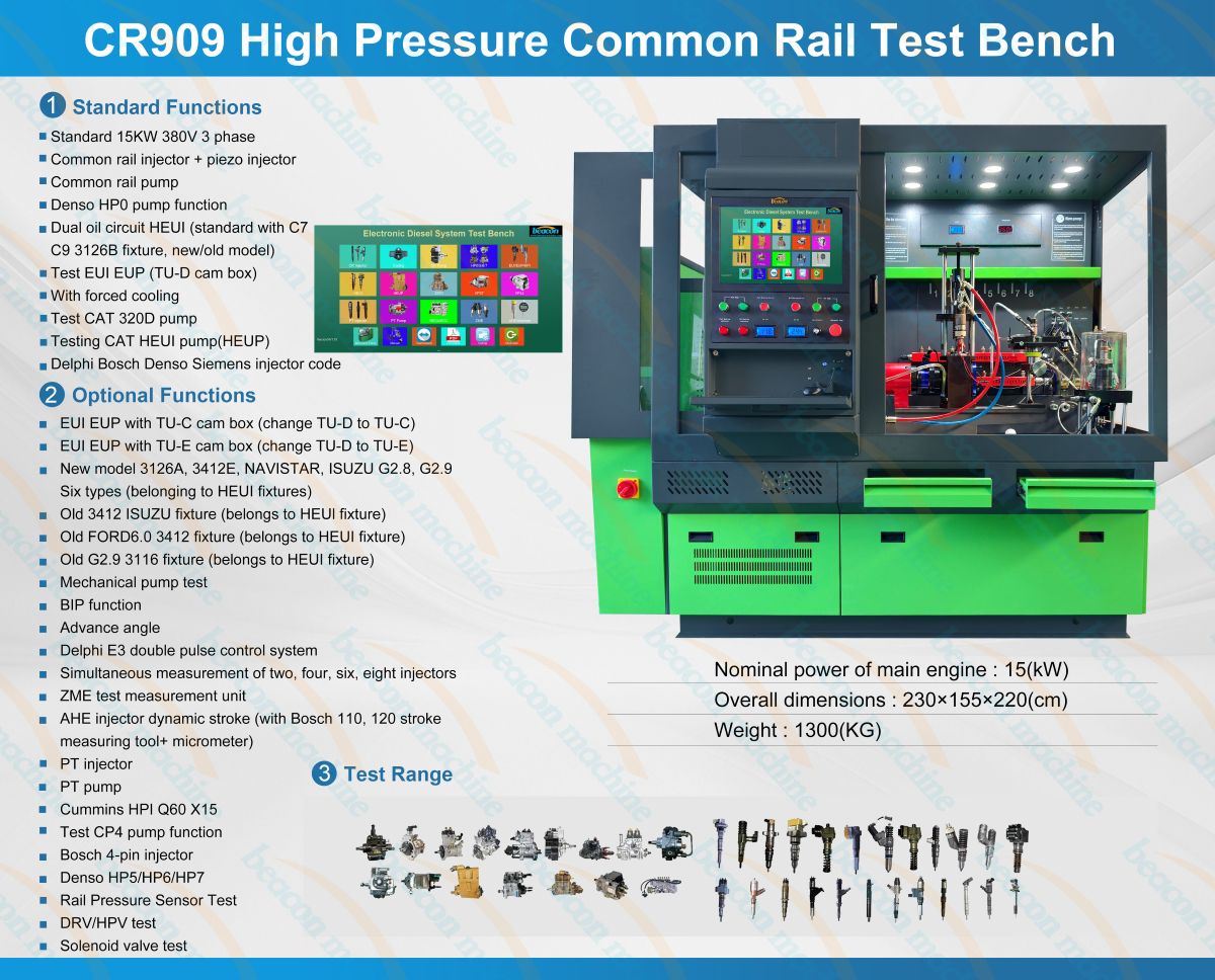 El banco de pruebas multifunción CR909 Common Rail integra en una sola línea equipos para pruebas Common Rail, inyectores piezoeléctricos, bombas CR y equipos de prueba HPI/PT/HEUI/EUI/EUP.
