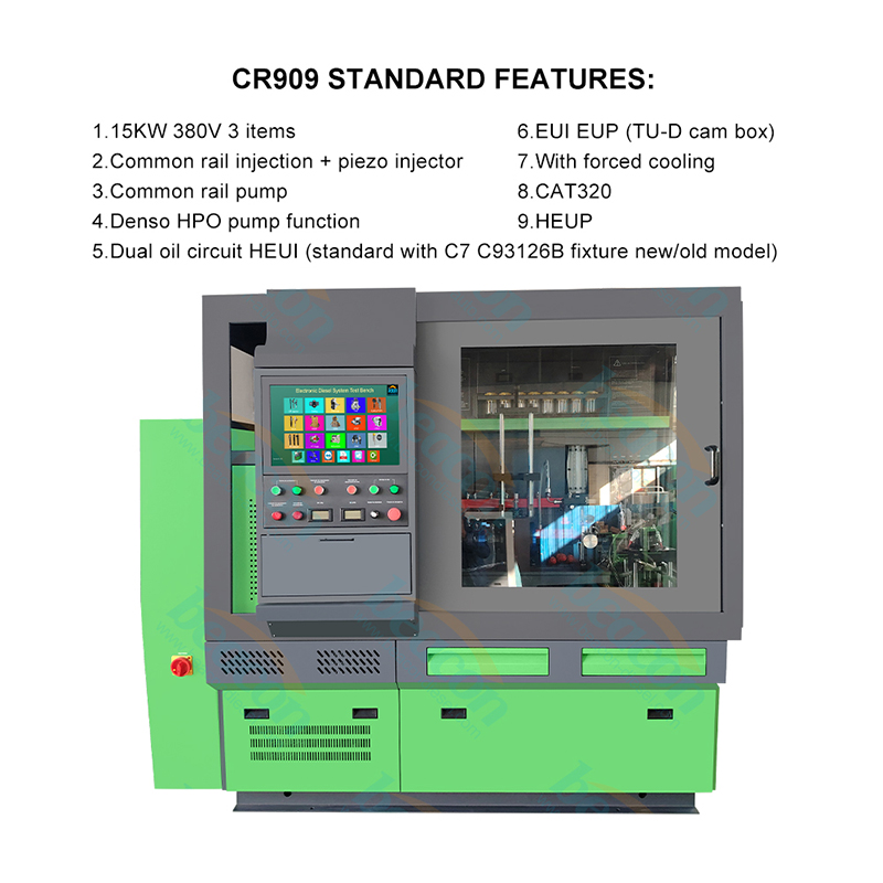 El banco de pruebas multifunción CR909 para inyectores y bombas Common Rail EUI, EUP, HEUI y CAT320D es nuestro banco de pruebas especializado más reciente, desarrollado independientemente, para evaluar el rendimiento de diferentes bombas mecánicas (VE/P71000…), bombas CR, inyectores CR, EUI/EUP con caja de levas TU-C, inyectores CAT HEUI, bombas CAT 320D y bombas de accionamiento CAT HEUI C7/C9. La cantidad de aceite se mide mediante un sensor de flujo y se visualiza directamente en el ordenador. Todos los datos se pueden consultar y guardar. Tecnología avanzada, rendimiento estable, mediciones precisas y funcionamiento sencillo.