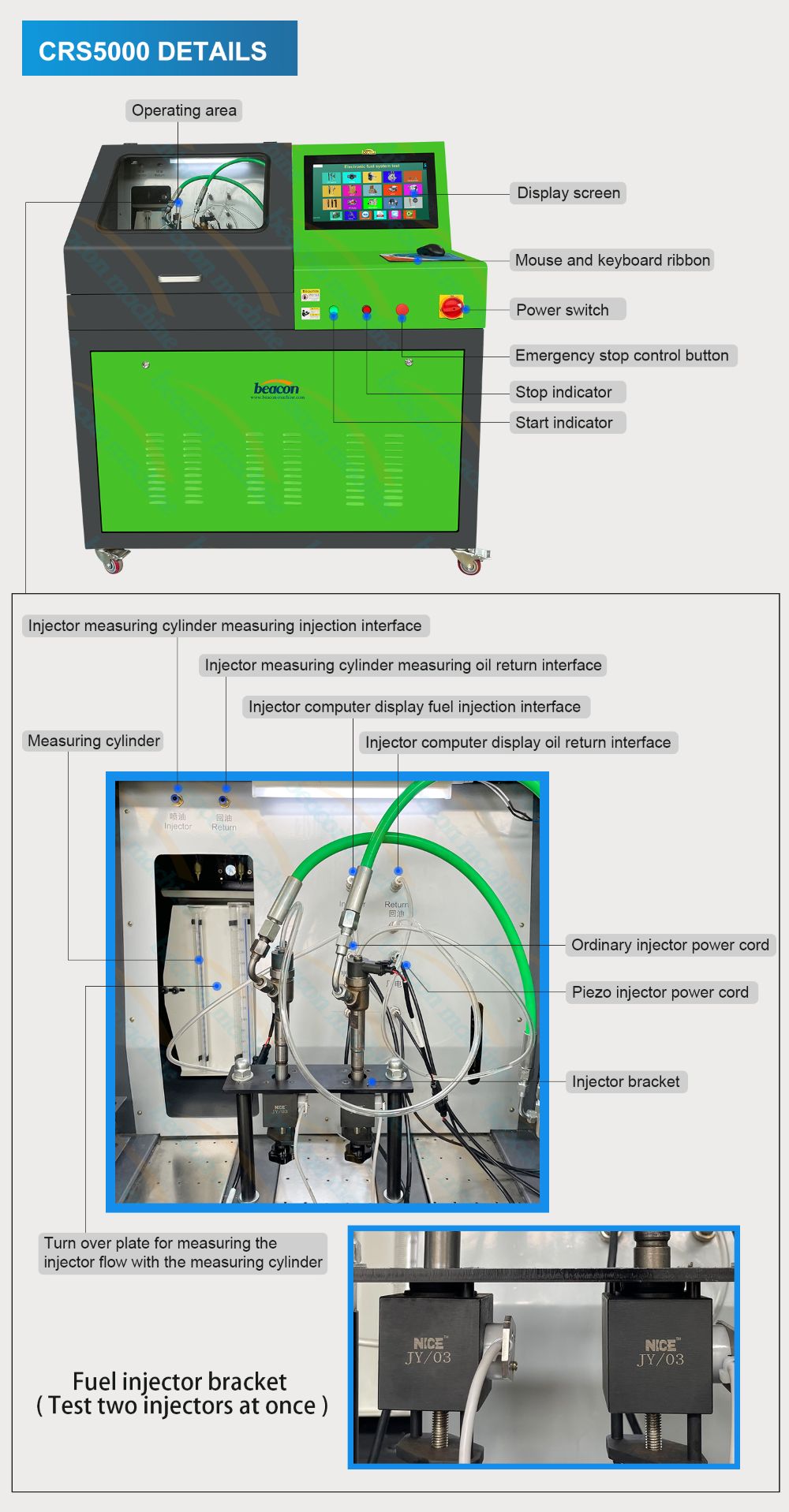 El banco de pruebas para inyectores common rail CRS5000 puede probar todo tipo de inyectores common rail y piezoeléctricos de marcas como Bosch, Denso, Delphi, Siemens, VOD, etc., y también permite la codificación de inyectores