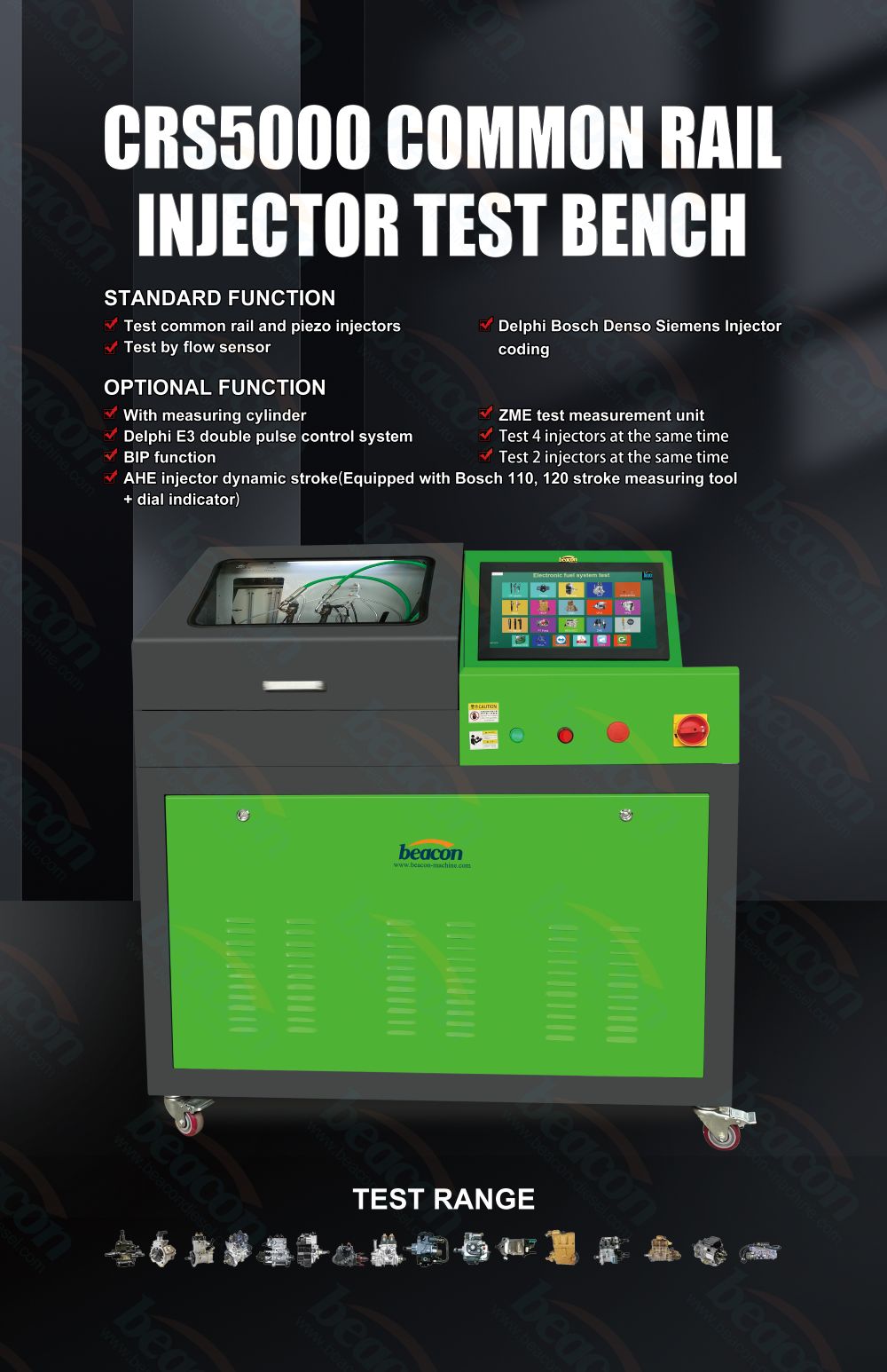 El banco de pruebas para inyectores common rail CRS5000S puede probar todo tipo de inyectores common rail y piezoeléctricos de marcas como Bosch, Denso, Delphi, Siemens, VDO, etc., y también permite la codificación de inyectores