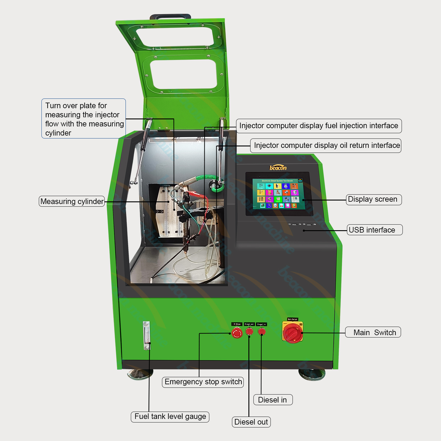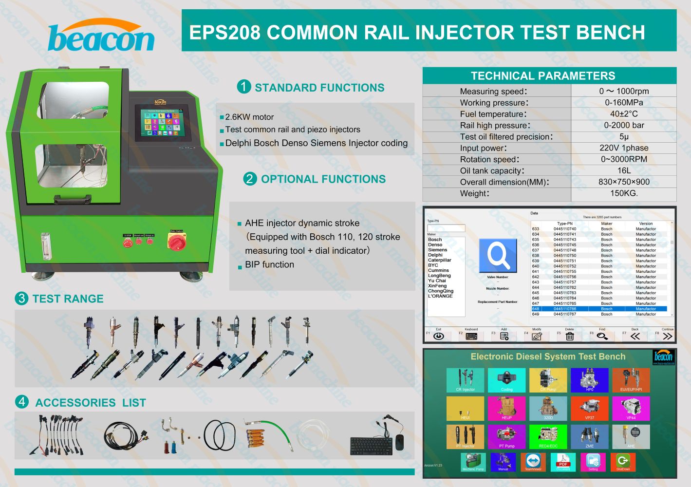 El banco de pruebas de inyectores common rail EPS208 puede probar todo tipo de inyectores common rail y piezoeléctricos de marcas como Bosch, Denso, Delphi, Siemens, VOD, etc., y también permite la codificación de inyectores