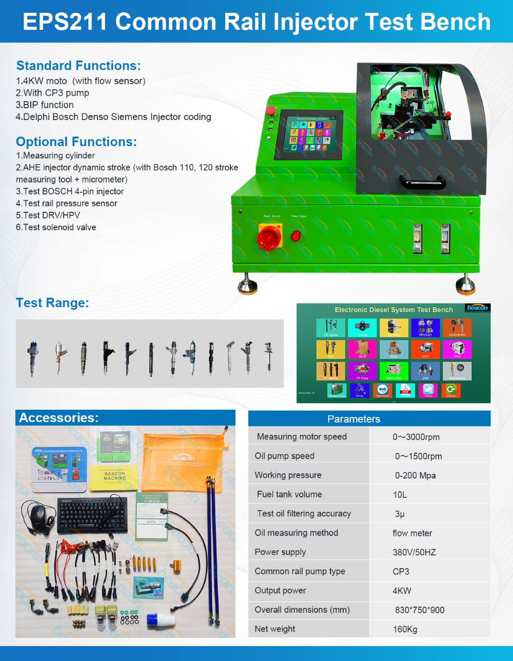 El banco de pruebas EPS211 para inyectores common rail de alta presión, de 4 kW y 380 V/220 V, cuenta con una bomba de aceite Bosch CP3 y dos sistemas de medición: un sensor de flujo de inyectores y una copa de vidrio. Permite probar todo tipo de inyectores common rail y piezoeléctricos mediante la copa de vidrio o el sensor de flujo. Además, realiza la codificación de inyectores e incorpora la función BIP.