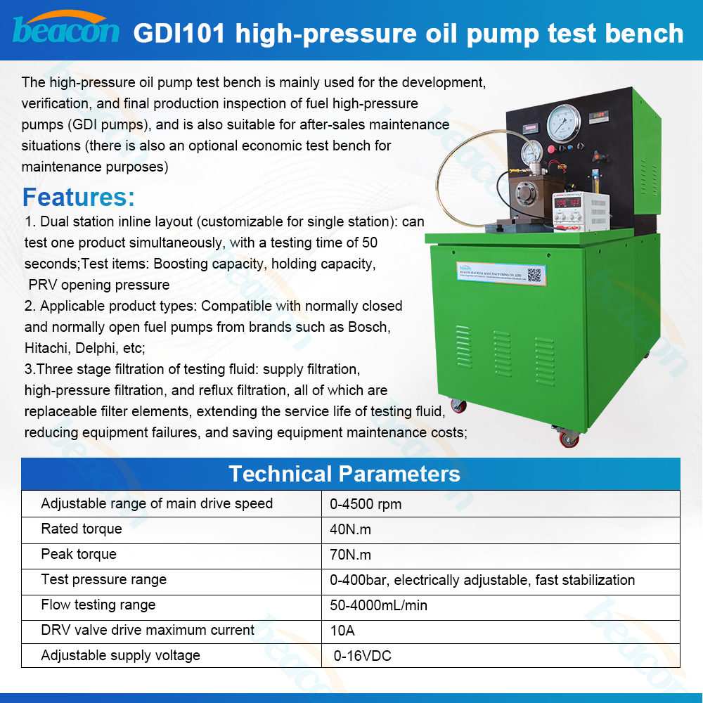 El banco de pruebas para bombas de gasolina GDI101 se utiliza principalmente para el desarrollo, la verificación y la inspección final de producción de bombas de combustible de alta presión (bombas GDI)