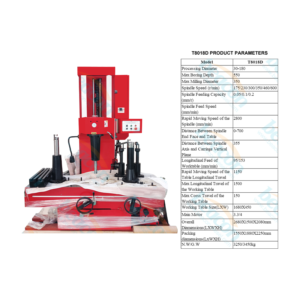Mandrinadora T8018D utilizada principalmente para mandrilar orificios de cilindros y de camisas de cilindros de motores de combustión interna de vehículos y tractores, también se utiliza para mandrilar con precisión orificios interiores de otras piezas